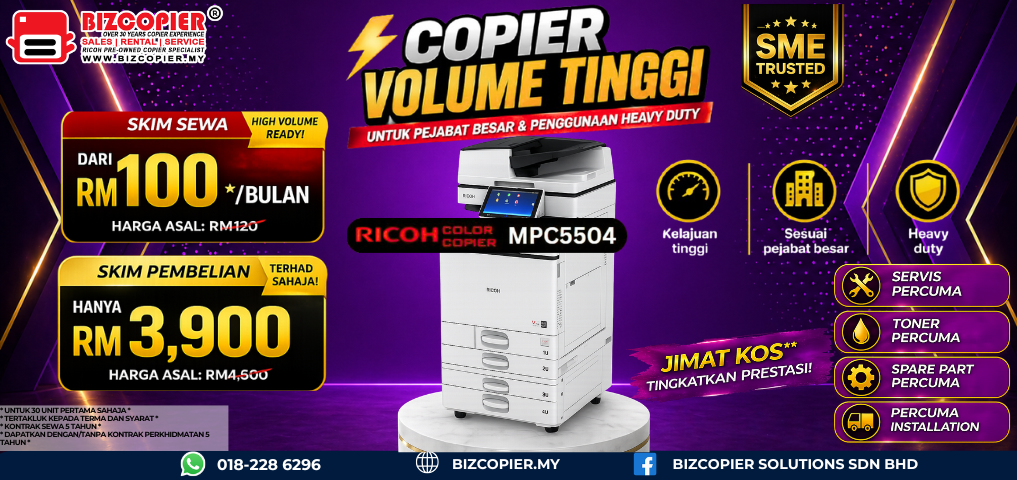 Introducing our RICOH Color Copier Rental Scheme Promotion! At BIZCOPIER Solutions Sdn Bhd (BIZCOPIER), we’re dedicated to revolutionizing your office environment with top-tier Ricoh Photocopiers at the most competitive rates in Malaysia.