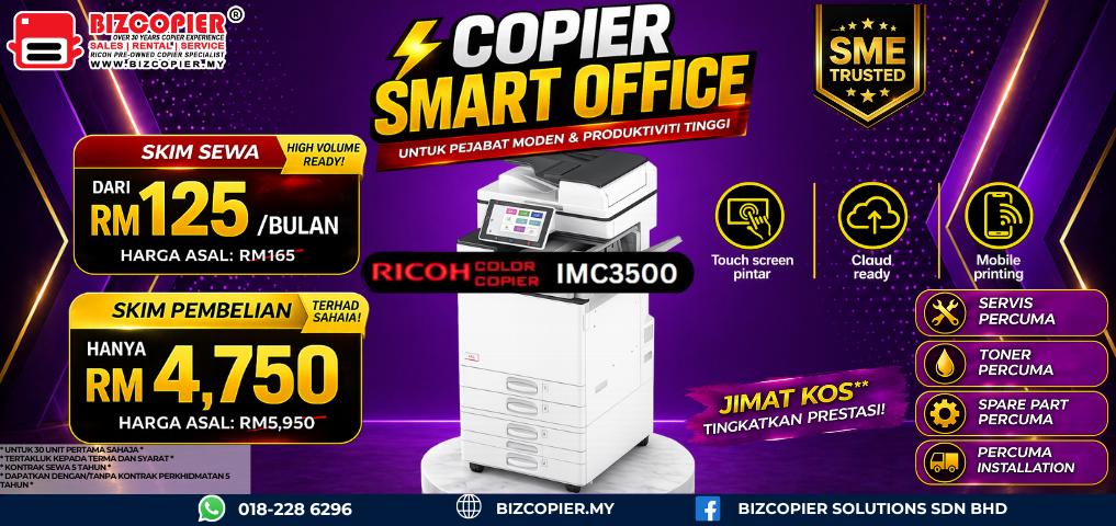 Introducing our RICOH Color Copier Purchase Scheme Promotion tailored for businesses in SELANGOR! At BIZCOPIER Solutions Sdn Bhd (BIZCOPIER) , we’re dedicated to helping you unlock efficiency with our unbeatable purchase packages.